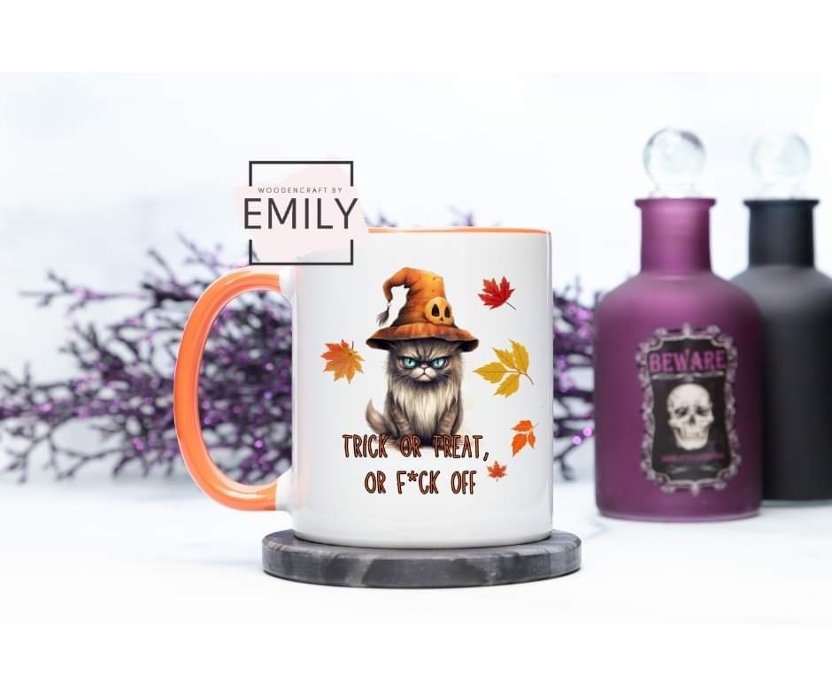 Kubek “Trick or Treat or F*ck Off” to idealny wybór dla miłośników czarnego humoru i świąt Halloween.