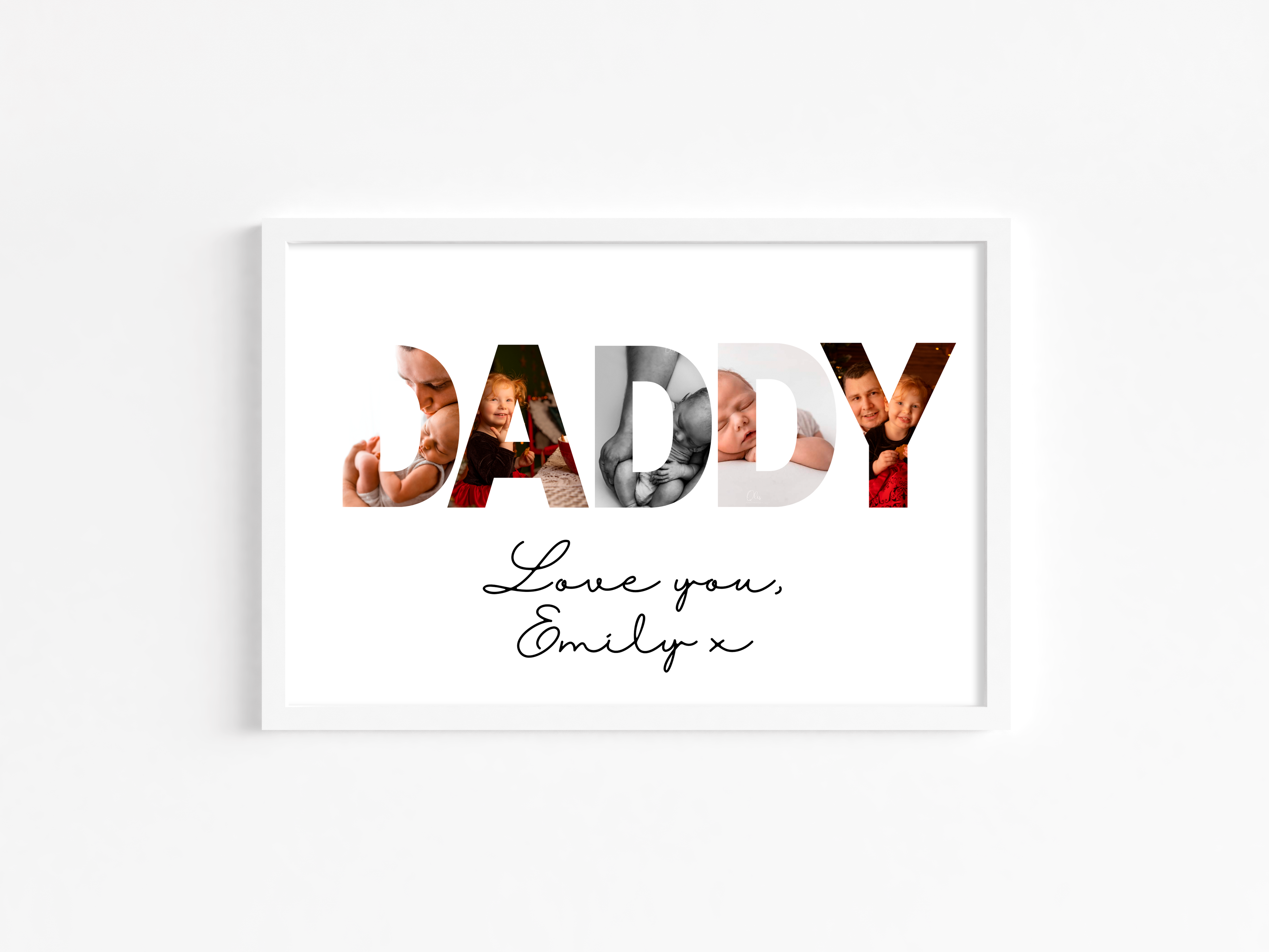 Stwórz wyjątkową pamiątkę dla taty personalizowanym printem, na którym napis “DADDY” jest utworzony ze zdjęć. To oryginalny i wzruszający sposób, aby uhonorować wspólne chwile i wyrazić swoją miłość. Wystarczy wybrać ulubione zdjęcia, a ja stowrzę niepowtarzalny kolaż, który będzie doskonałą ozdobą każdego wnętrza. Idealny na Dzień Ojca, urodziny lub inne specjalne okazje. Dodaj osobisty akcent do swojego prezentu i spraw, by tata poczuł się wyjątkowo.