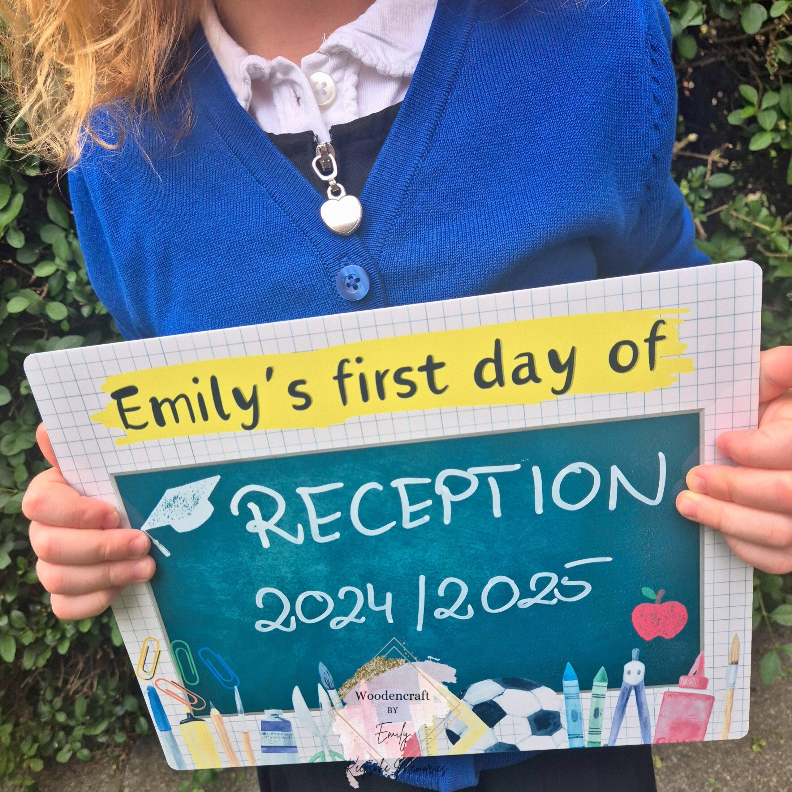 Możesz spersonalizować napis, np. Emily’s first day of, aby nadać tabliczce indywidualny charakter.