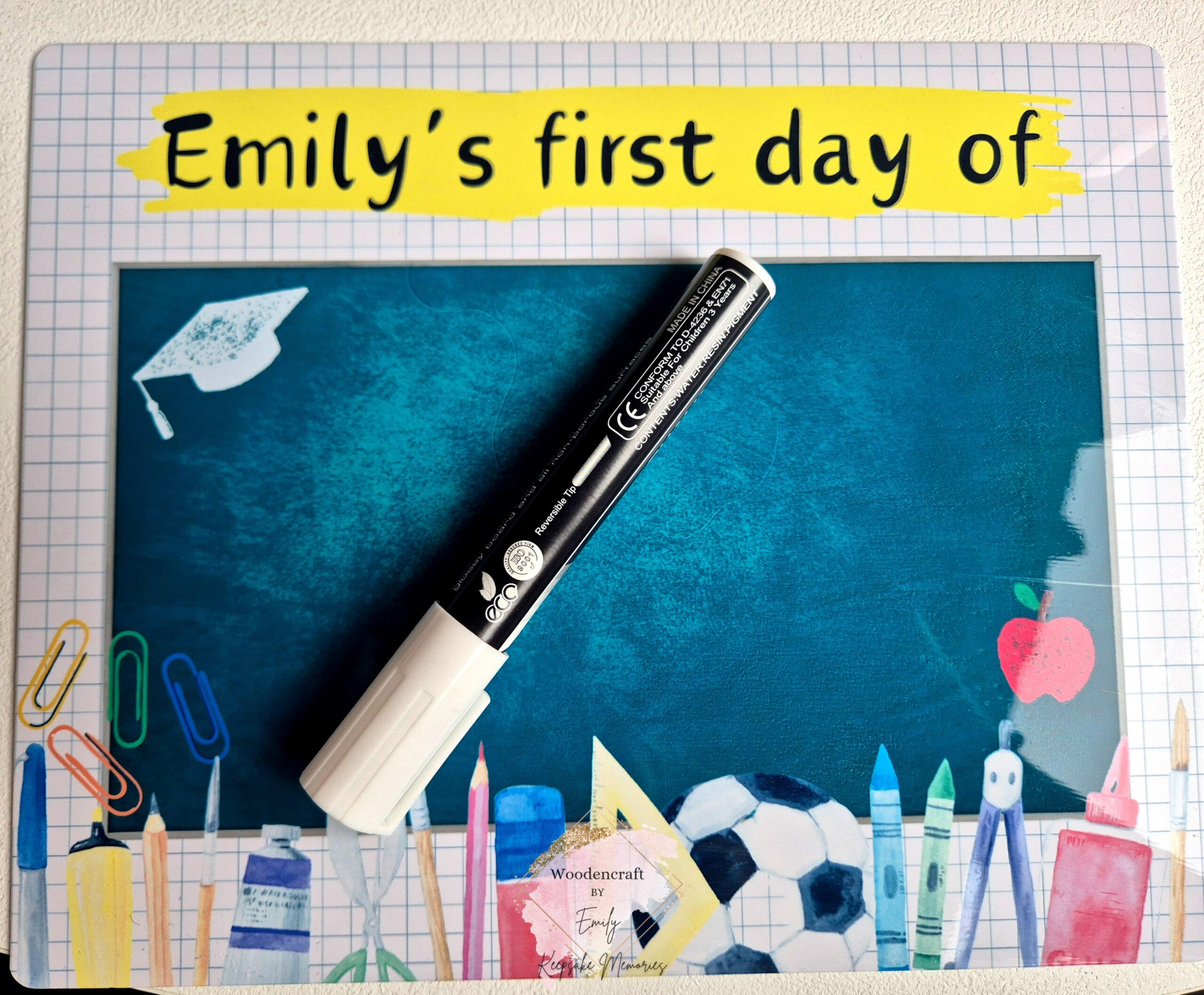 Wielokrotnego użytku – do zestawu dołączony jest pisak suchościeralny. Z łatwością wpiszesz imię, klasę, datę czy rok i szybko usuniesz zapis, by wykorzystać tabliczkę ponownie.