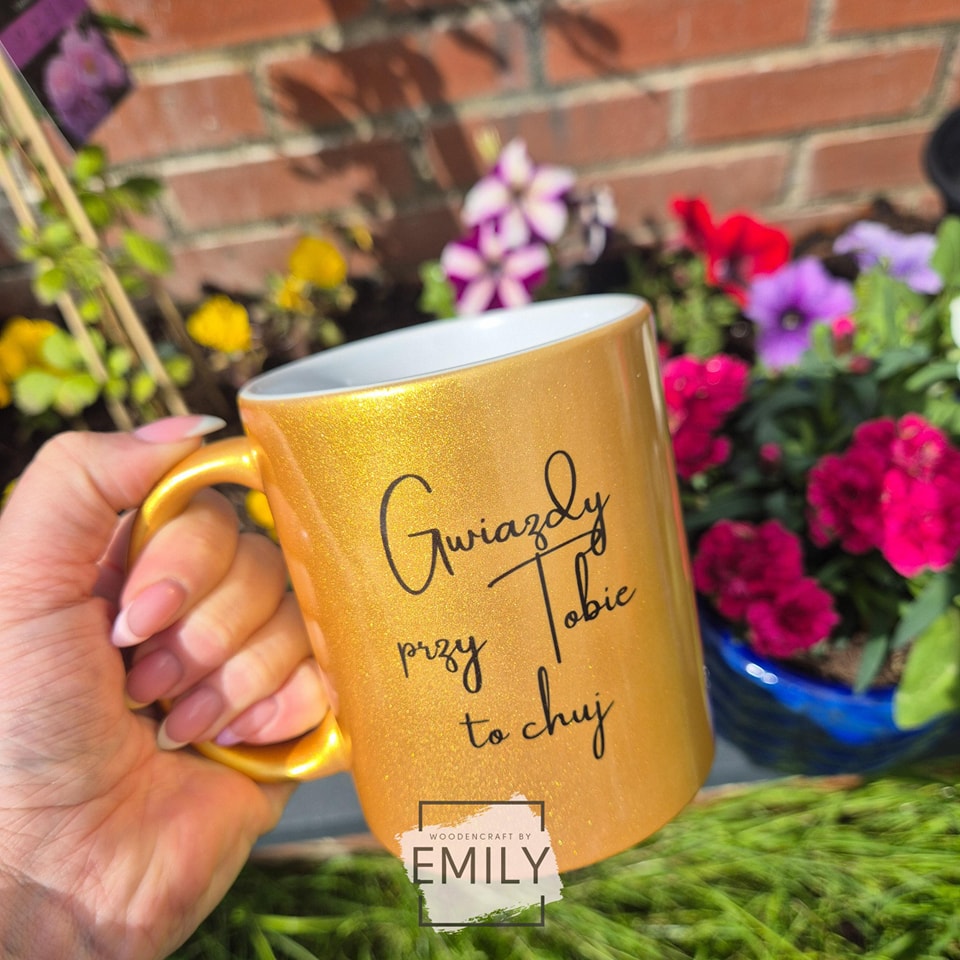 ✨☕ Złoty brokatowy kubek „Gwiazdy przy Tobie to chuj” to propozycja dla tych, którzy kochają błysk, odważny humor i kubki z charakterem.